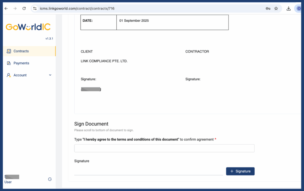 - Once submitted, the contract will be marked as Signed and stored securely in your account.