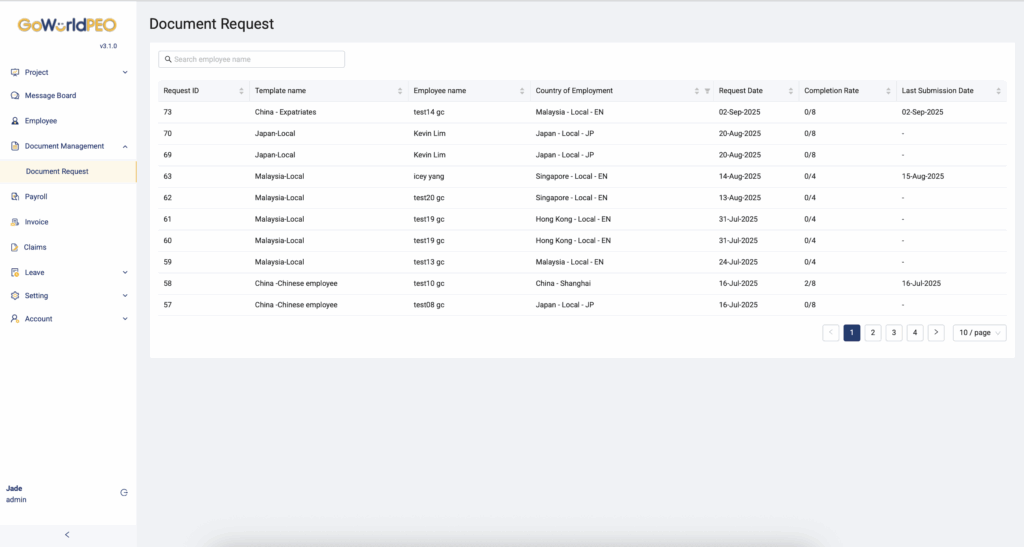 The Document Management module in GoWorldPEO allows you to handle all employment-related document requests in one central place. From generating templates to monitoring completion status, this section ensures a smooth and compliant documentation process for both administrators and employees.