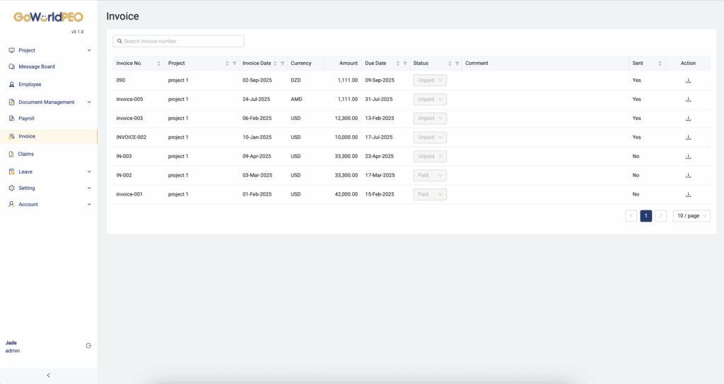The Invoice Management module in GoWorldPEO allows administrators and finance teams to efficiently manage billing processes between clients and the PEO service. This includes viewing, tracking, and verifying invoices related to employee management, payroll, and other services. The system centralises all financial records in one place, ensuring full transparency and simplified accounting workflows.