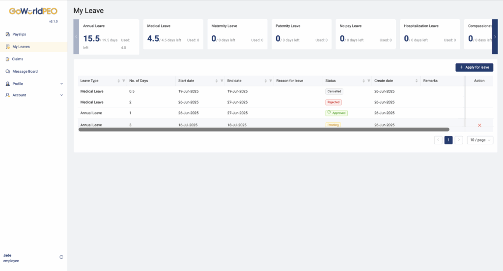 • No-pay Leave, Hospitalisation Leave, Compassionate Leave, etc. – Show balances according to company policy.