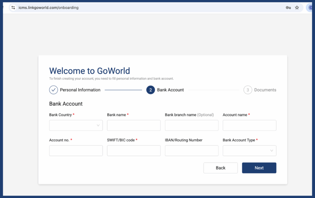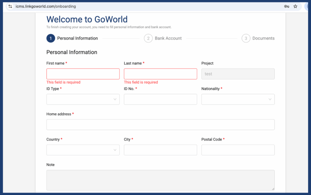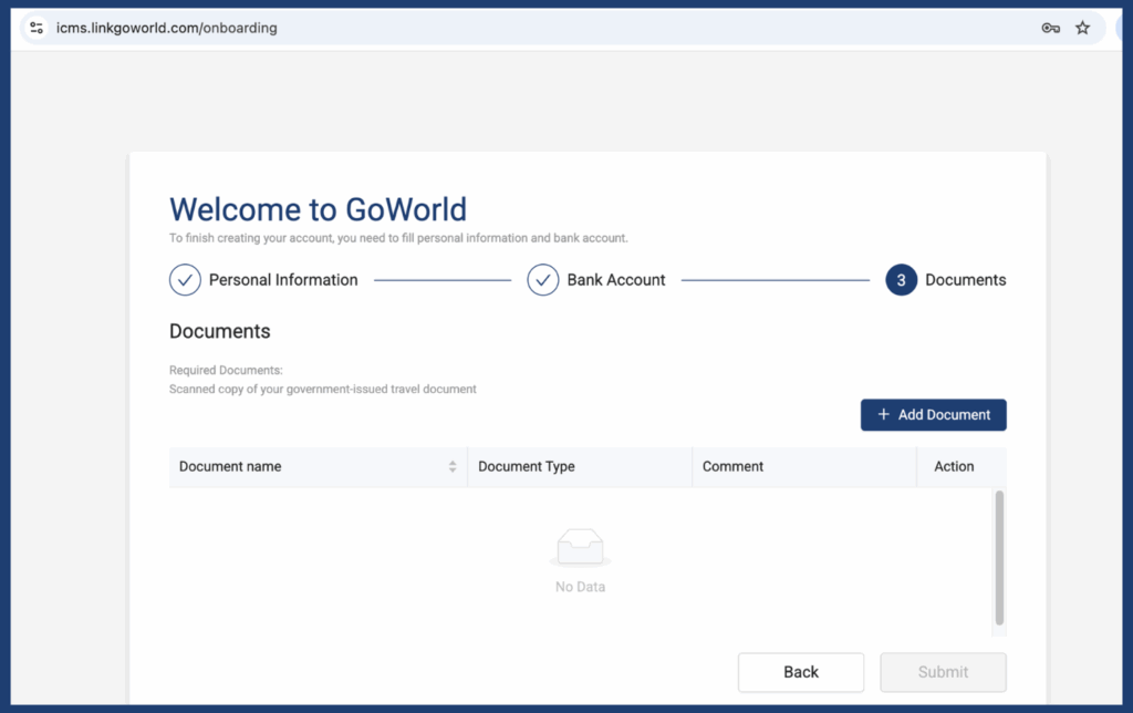 Easily upload identification, certifications, or any other documents requested by the GoWorld team. All files are stored securely.
